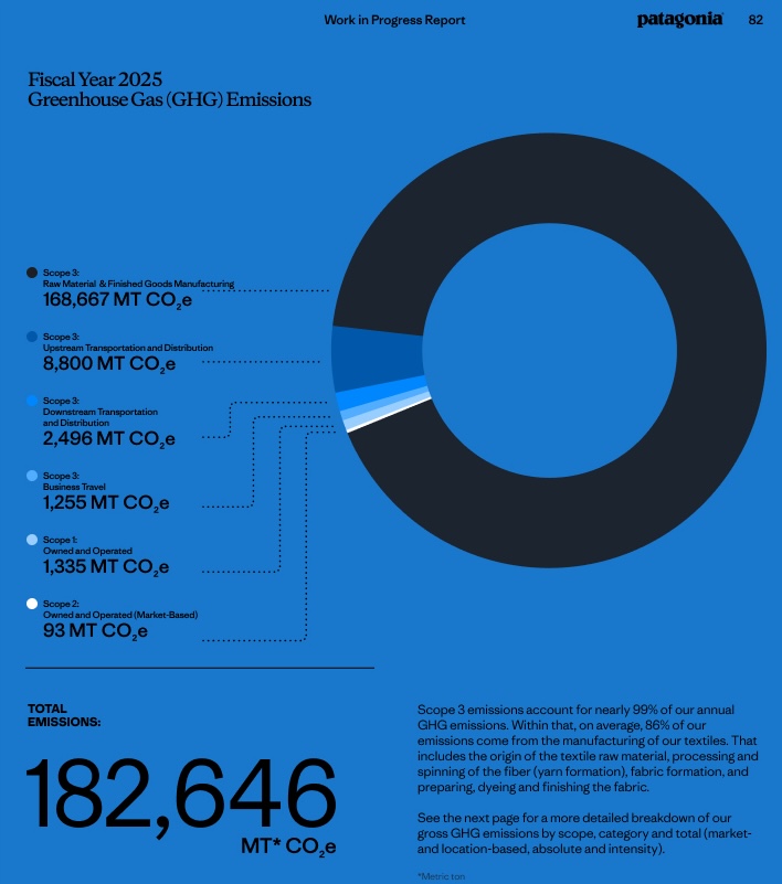 Raw materials and finished goods manufacturing accounted for 92 percent of Patagonia’s footprint in fiscal year 2025, according to the 130-page narrative, which pulls together disclosures that the Ventura, California, company makes on its website, through certification audits and to nonprofits.