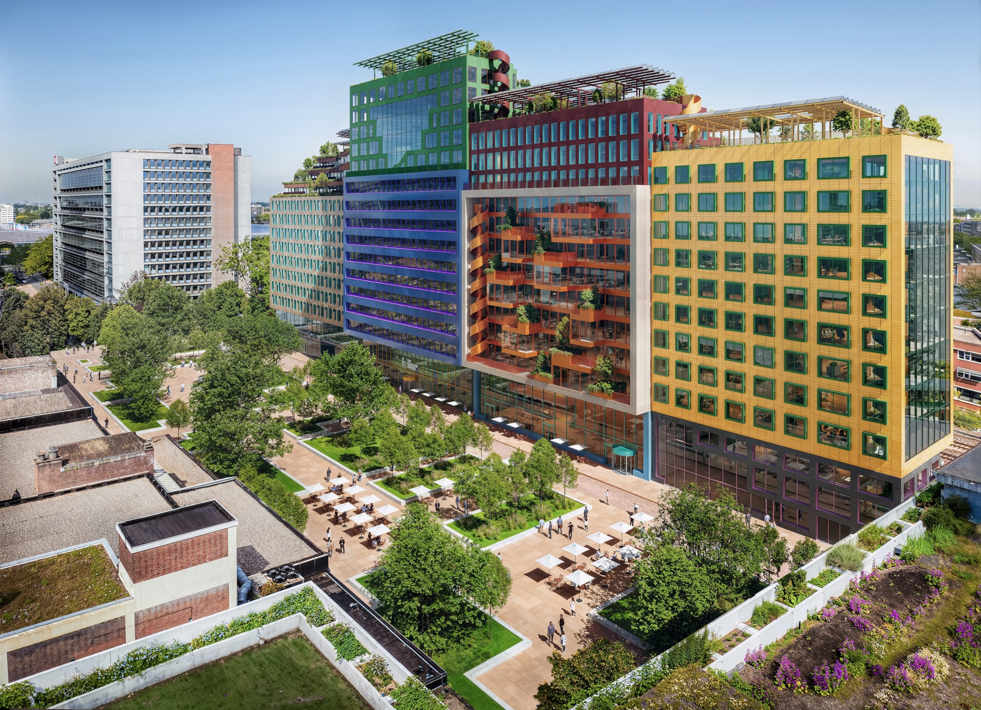 The upper levels of the office include a restaurant and a two-storey events venue with views across the city. A publicly accessible roof landscape designed by Juurlink and Geluk extends the full length of the building, incorporating planting, water-retention features, and shaded areas beneath a pergola fitted with solar panels.